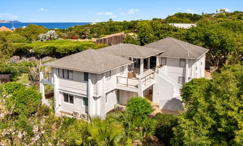The existing villa is a two-bedroom, two bathroom dwelling elevated on columns and a cistern approx. 9’-0” above grade. Two traditional wood sided, hipped roof pavilions, are elevated by a modern structure of exposed tapered concrete columns which support both the suspended floor slab and the roofs. These square hipped roof pavilions are joined by a central elevated veranda. This veranda is also topped by a rectangular hipped roof and extends to uncovered balconies in front of the Master Suite Pavilion and the Living pavilion which also includes the guest bedroom and bathroom. The site has large boulders at and just below grade. Much of the site is forested and it straddles a small ghut/ gully.
