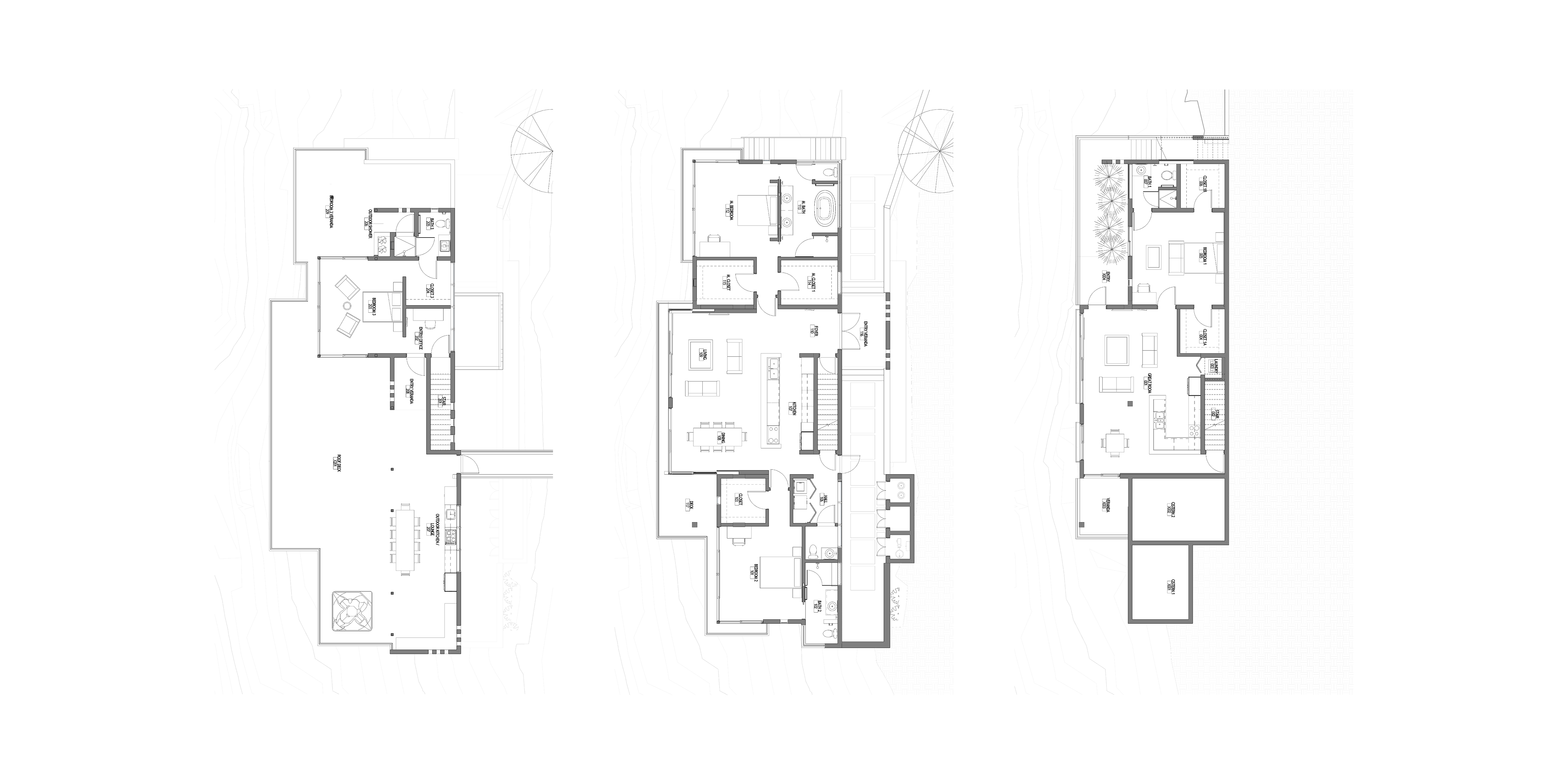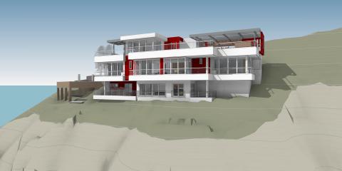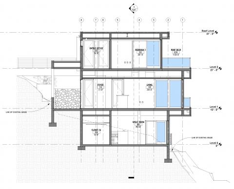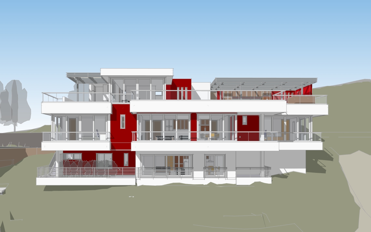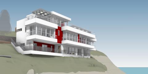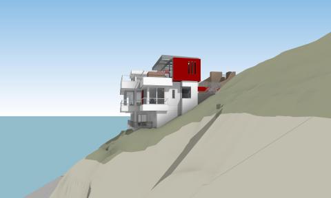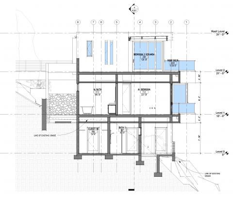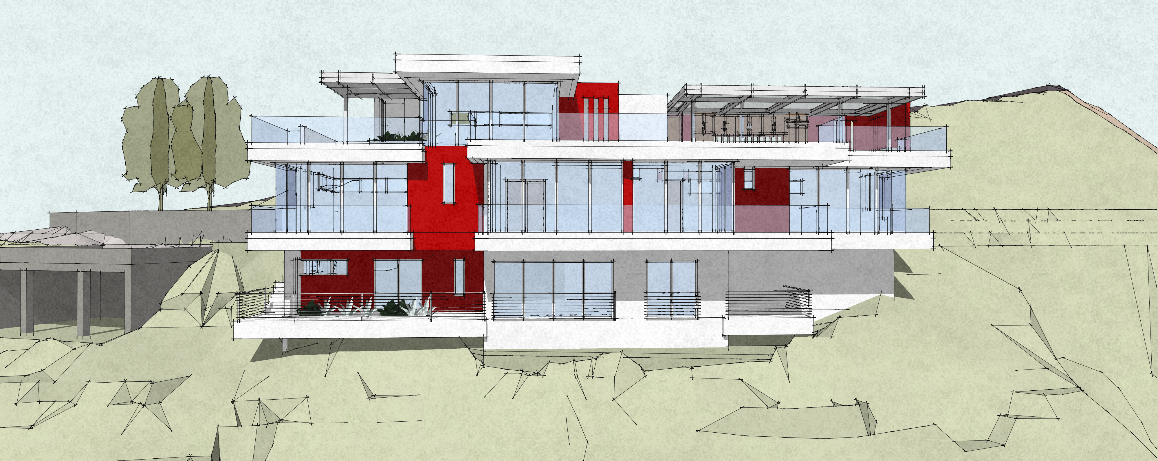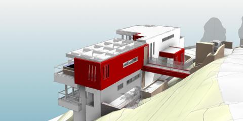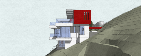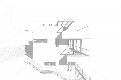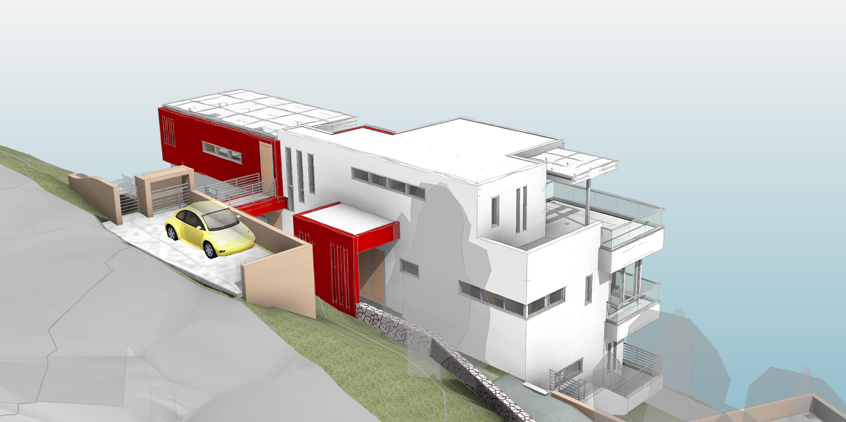 Casa MarVista nestles into a bluff overlooking the Caribbean Sea with views of several of the Virgin Islands in the near distance.  The volume is defined by white horizontal planes delineating the different functional areas of the building.  At the base,there is a one-bedroom rental apartment or nanny suite; the middle hosts the main family spaces,and a guest suite perches at the top adjacent to the roof-deck entertaining area.  Designed for indoor-outdoor living in the Caribbean climate,the glass walls open up at all levels to admit the sea breezes,while the overhangs provide much needed shade and hide roll-up hurricane shutters.  Smaller windows to the rear provide cross ventilation and facilitate privacy from the road above.  Pops of brilliant colour create a vibrant contrast to the otherwise neutral palette.  It wouldn’t be Caribbean if we didn’t have some fun with it!!