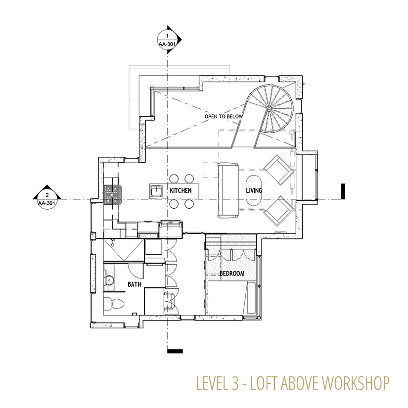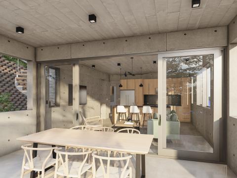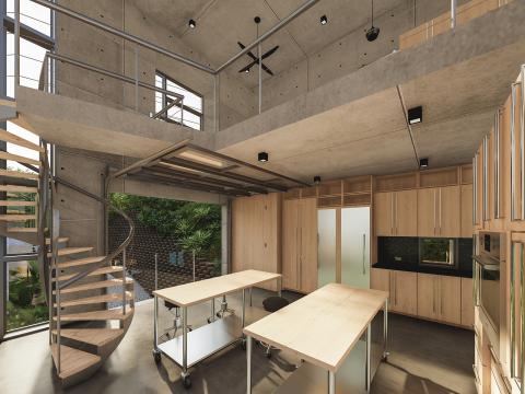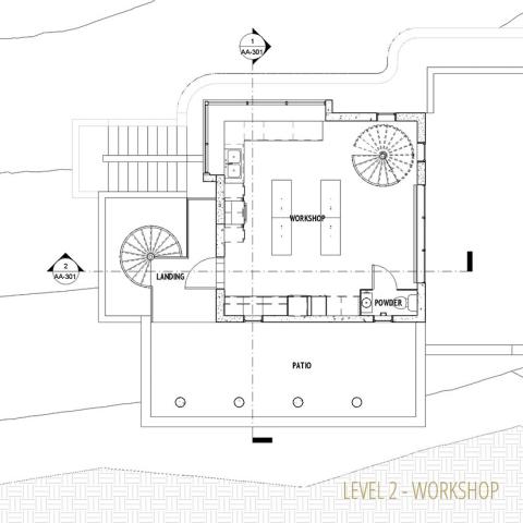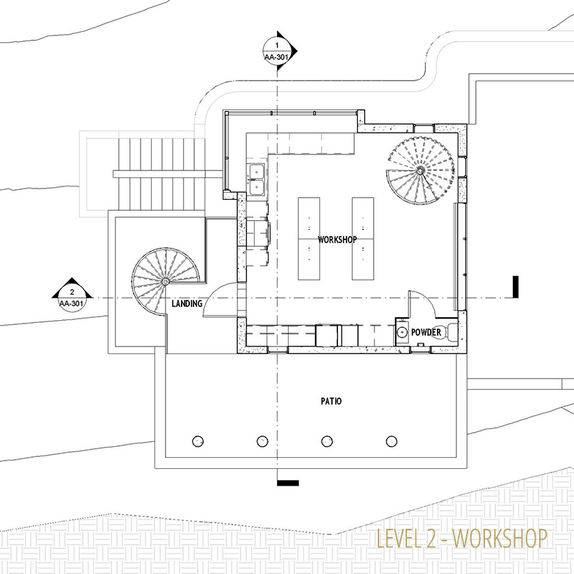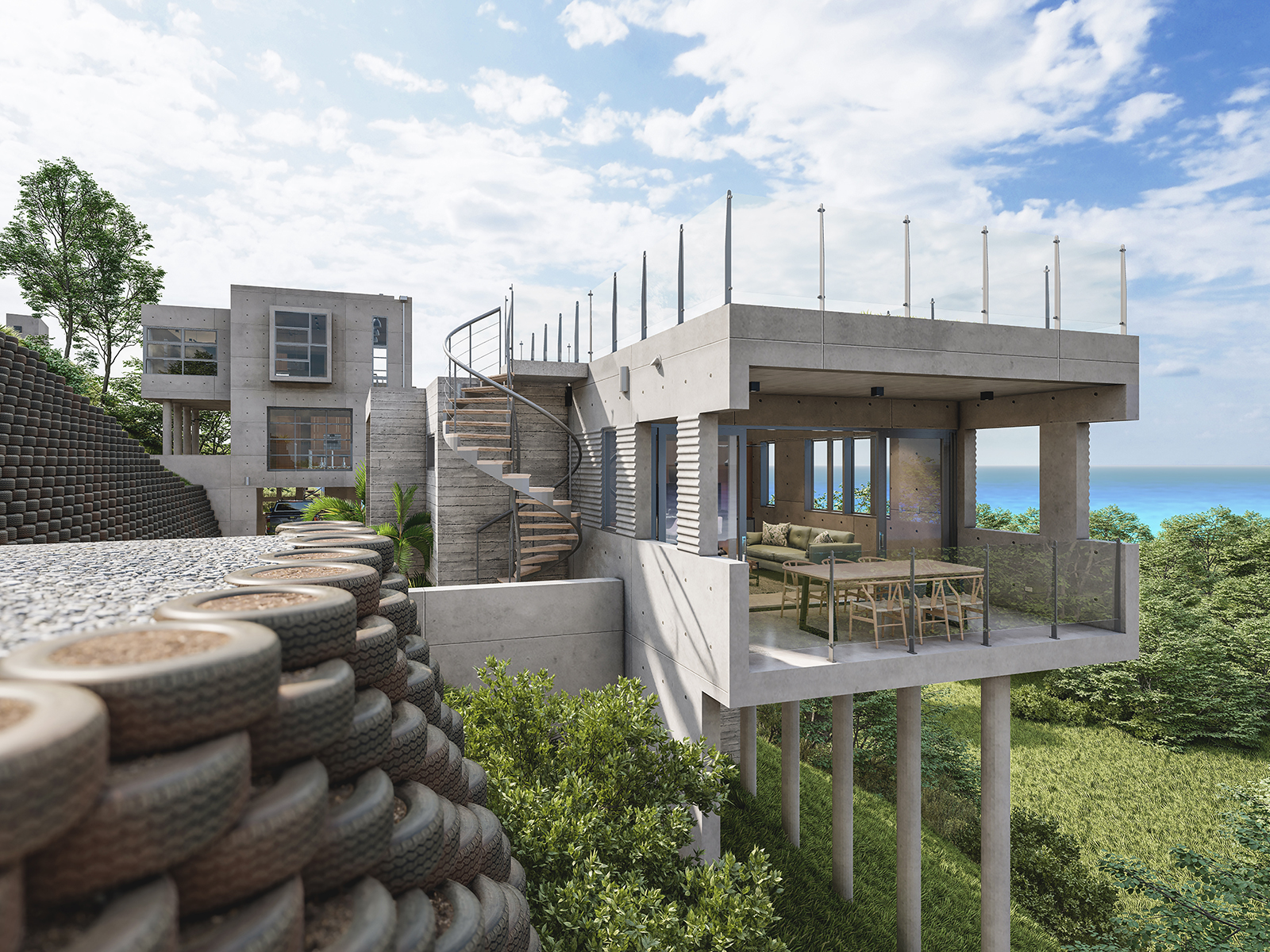 Silver Sage is designed to be perched on the side of a very steep hillside with expansive views of the valley and sea beyond. A study in contrasts, a strongly vertical tower hosting the workshop and loft for an environmental entrepreneur, is flanked by a horizontal cantilevered small home. The workshop and loft are also designed to accommodate an eco-tourism B&B experience. A study in raw materials, the structure explores different textures of finished concrete — plywood-formed, board-formed, and corrugated. Inside, raw plywood is used for cabinetry doors and dividing walls. No paint is intended, except where pre-existing on recycled wood elements. All exposed surfaces are to be finished with clear sealer so that the natural beauty of the material can be seen. The use of recycled tires in lieu of concrete or stone for the few site retaining walls is being explored.