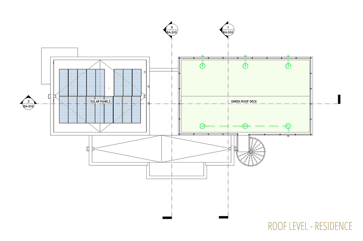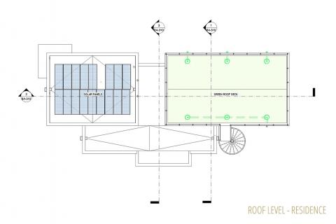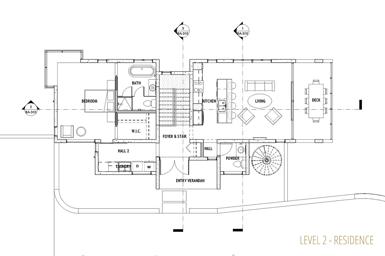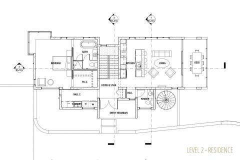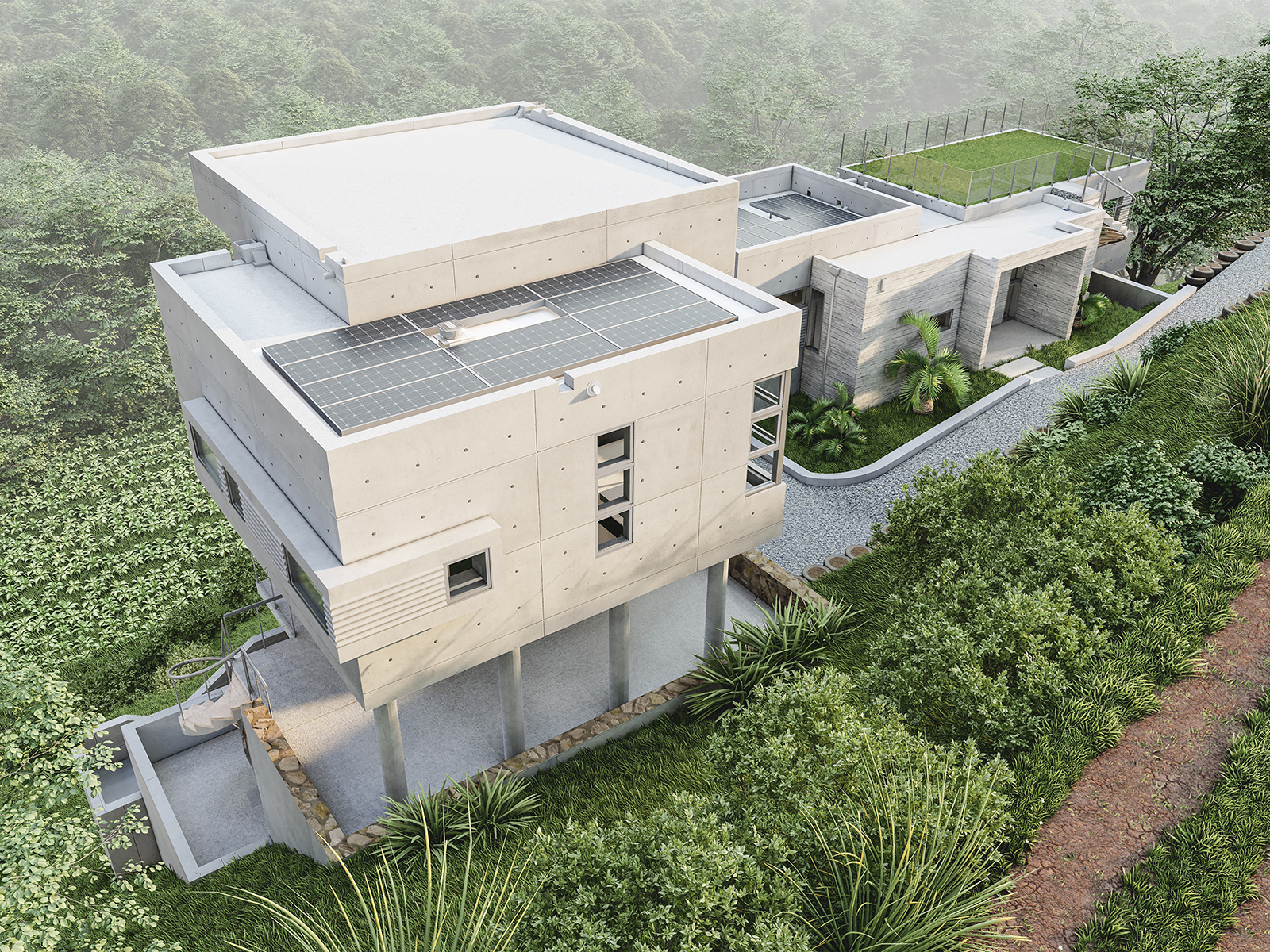 Silver Sage is designed to be perched on the side of a very steep hillside with expansive views of the valley and sea beyond. A study in contrasts, a strongly vertical tower hosting the workshop and loft for an environmental entrepreneur, is flanked by a horizontal cantilevered small home. The workshop and loft are also designed to accommodate an eco-tourism B&B experience. A study in raw materials, the structure explores different textures of finished concrete — plywood-formed, board-formed, and corrugated. Inside, raw plywood is used for cabinetry doors and dividing walls. No paint is intended, except where pre-existing on recycled wood elements. All exposed surfaces are to be finished with clear sealer so that the natural beauty of the material can be seen. The use of recycled tires in lieu of concrete or stone for the few site retaining walls is being explored.