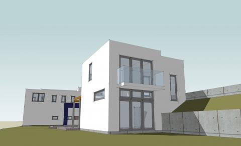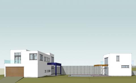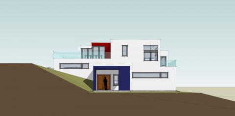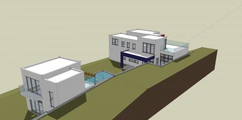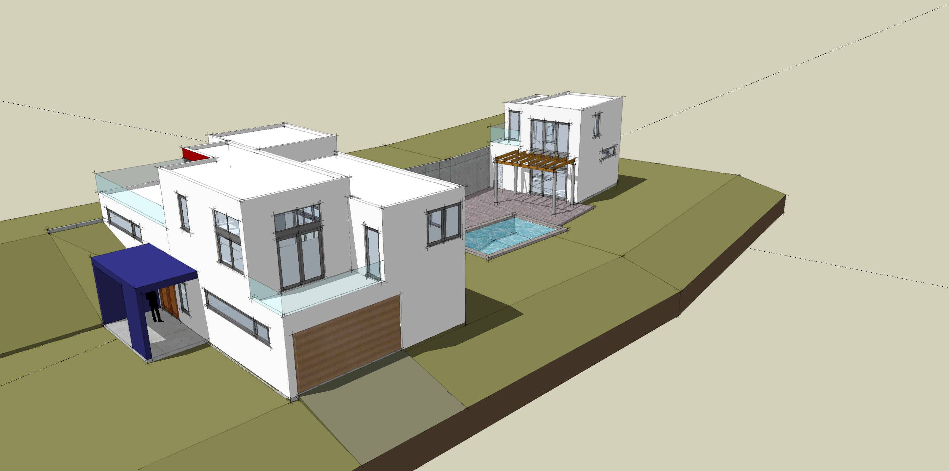 The clients are a young couple who sourced a home plan online to ensure it had all the features they desired. However the 70's cottage style was not to their liking. I worked with them to refine the plan and adapt it to their long narrow site while still accessing sea views from the Master Bedroom at the upper level. We added a small unit at the rear for recreation space and guest housing,and created a courtyard with a small swimming pool.
