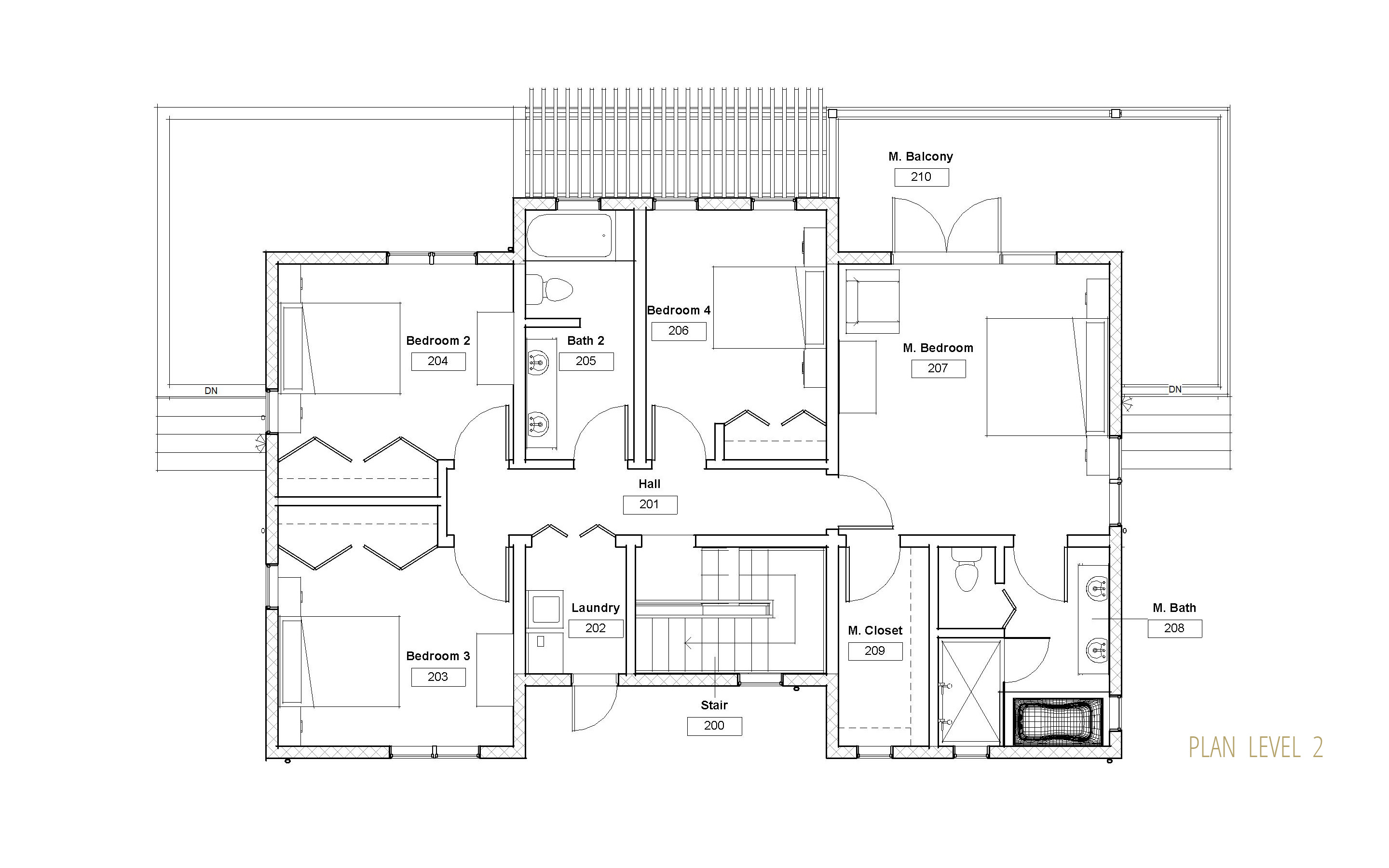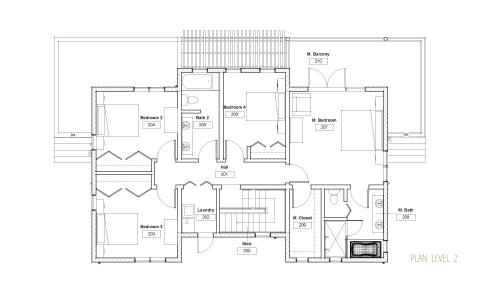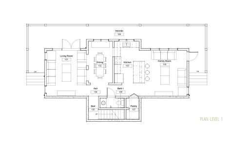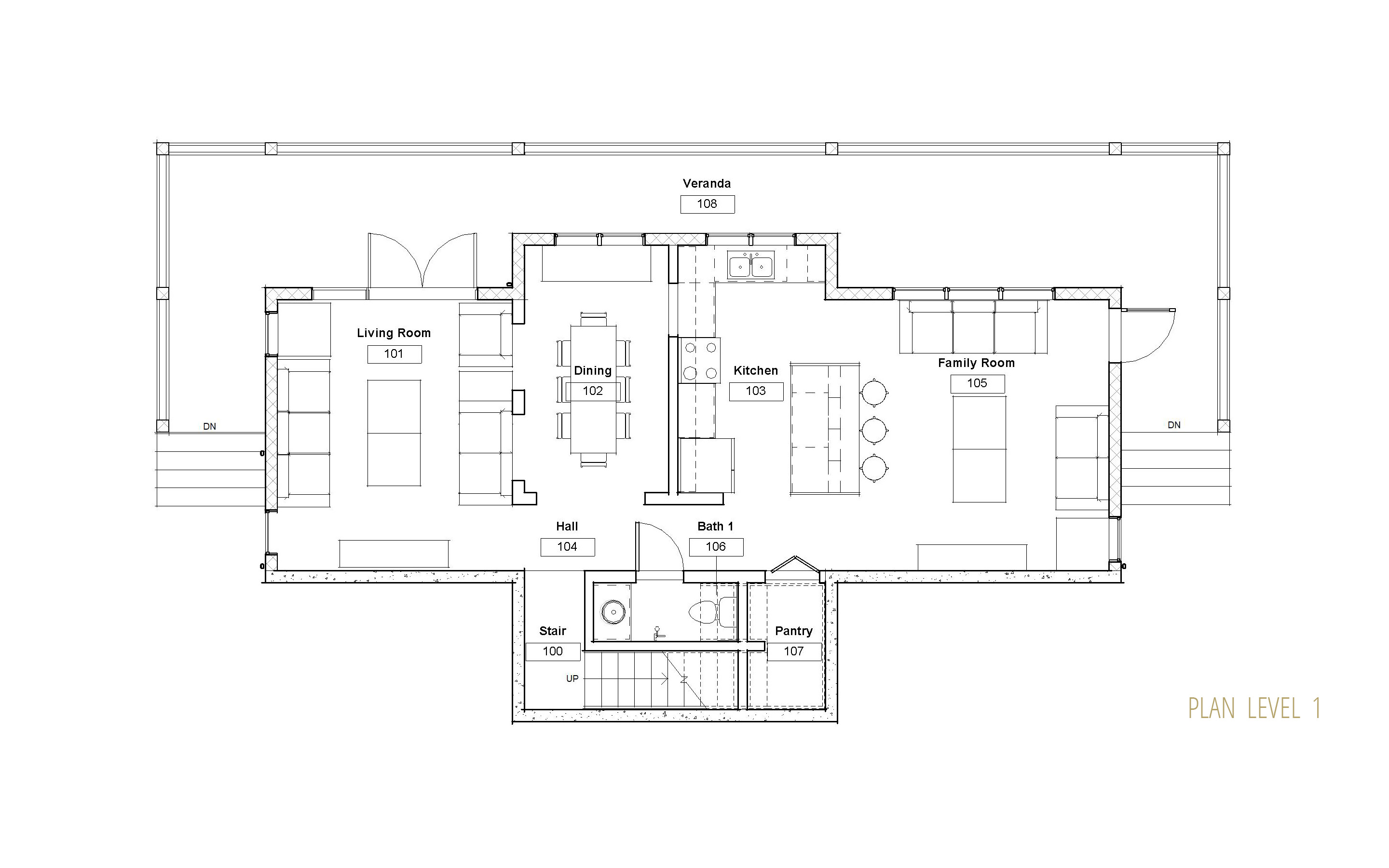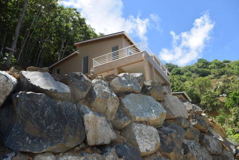 Egret’s Perch is a space-efficient 4 bedroom, 2 1/2 bath home,designed for a steeply sloped lot. The simple rectilinear layout is terraced into the hillside to avoid massive retaining walls separate from the house.  The open plan Living Areas have excellent flow and cross-ventilation, and the house has a small backyard at the upper level just outside the laundry. The design also features a covered entry, pantry, and outdoor entertaining space.  This is the first build for Egret's Perch and it comes with a few custom modifications including an extended wraparound Veranda and enlarged Master Balcony. It perches on a steep trapezoidal site overlooking Brewer's Bay. The design is available for purchase either as drawings adapted to the client’s chosen site, or as a turn-key custom build.