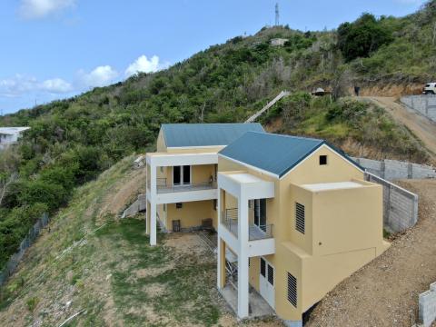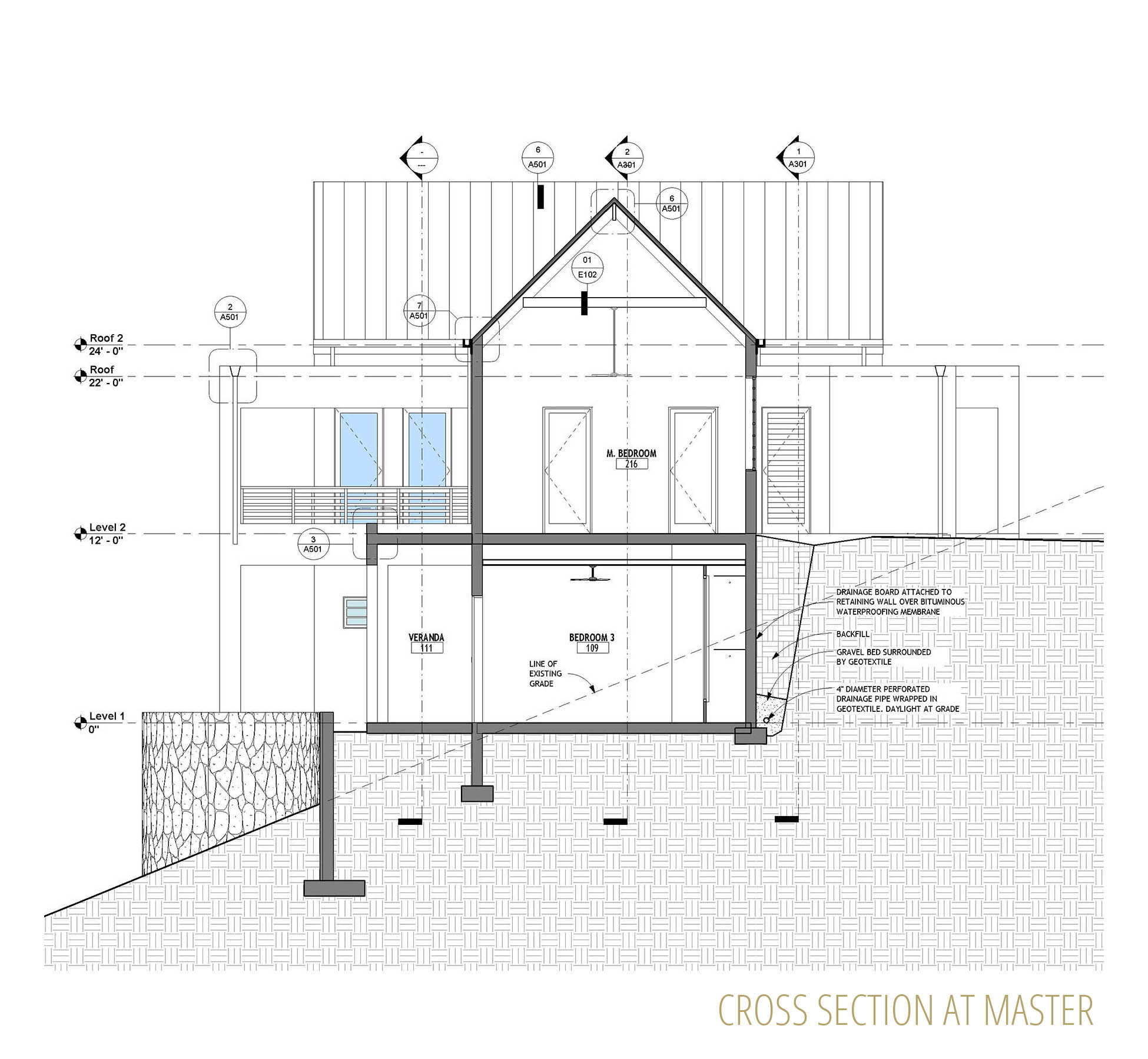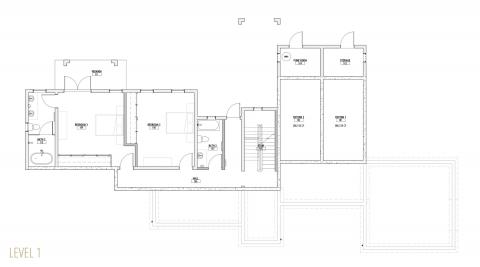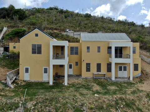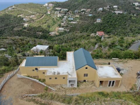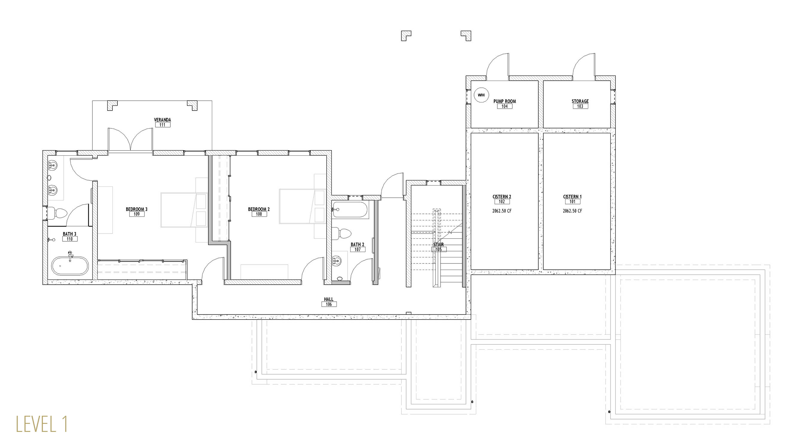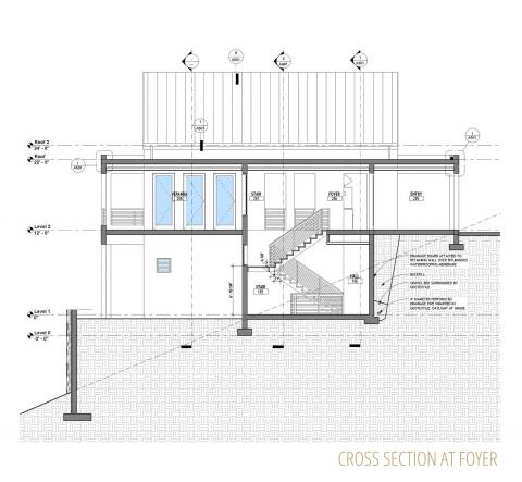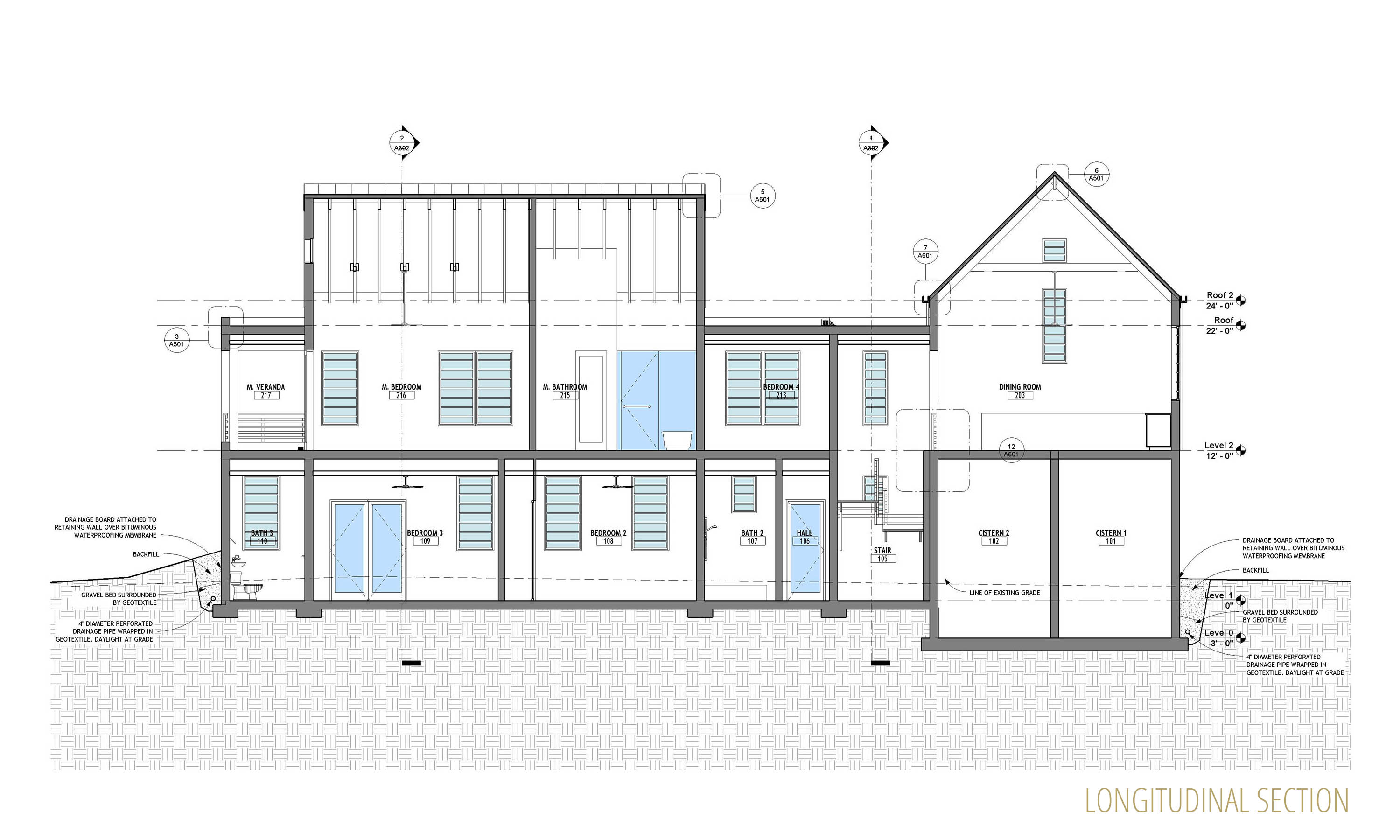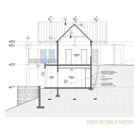 This design was inspired both by traditional British Caribbean cottages and by the work of Hugh Newell Jacobsen in reinterpreting traditional New England homes.  These building types share a common DNA, while set in very different climates.  High ceilings throughout encourage passive cooling, by exhausting heat through clerestory windows set into the gable ends.  The generous floor to floor height navigates the site slope, balancing cut and fill while minimizing the need for retaining walls.   The Master Suite and Study/ Guest Bedroom are on the Entry level, along with the open plan Great Room, to allow for single-level living. Two additional bedrooms and bathrooms are tucked below alongside the generous cisterns; both bedrooms have ample front exposure for adequate ventilation.  The lower access hallway runs along a fully waterproofed, drained and furred out retaining wall to ensure that the spaces remain dry and mold free, and large louvered windows and doors ensure excellent air circulation throughout.