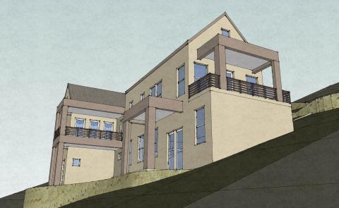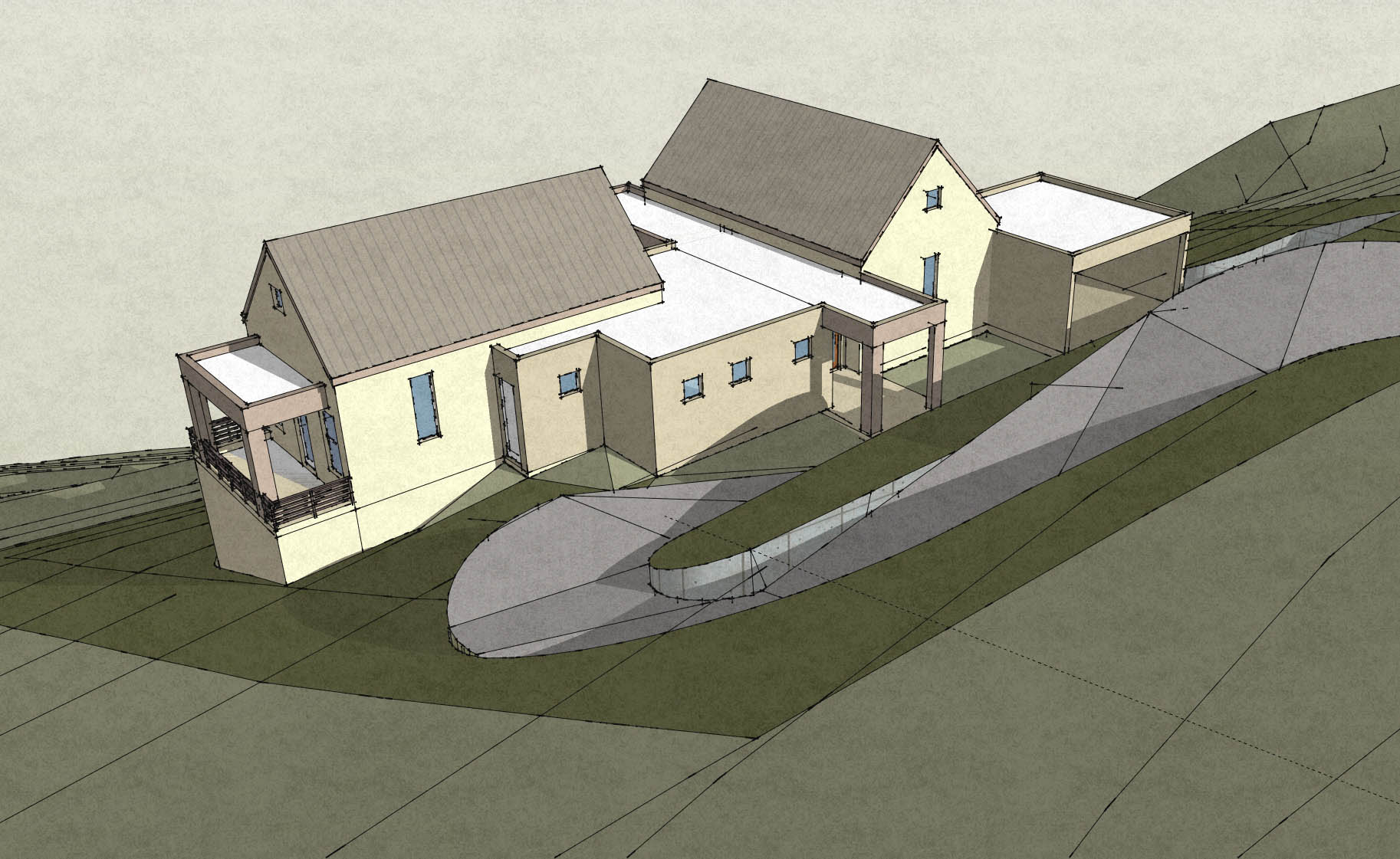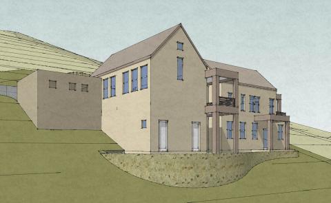 The first build for Newell, overlooks a valley with sideways views of the sea to both east and west.  The construction of the house required no separate retaining walls, however some were unavoidable to support the driveway.  This design is available for purchase and adaptation to other similar sites.