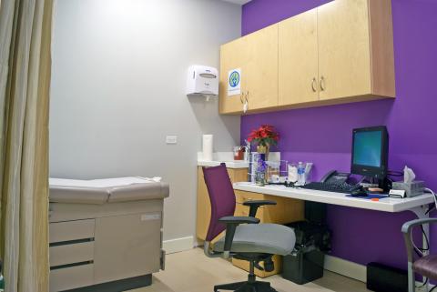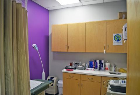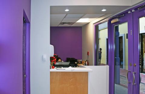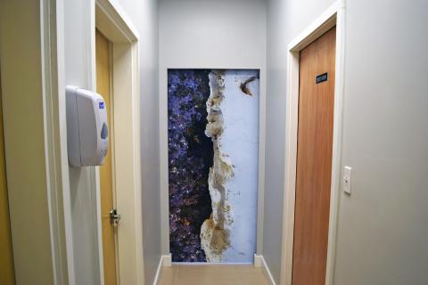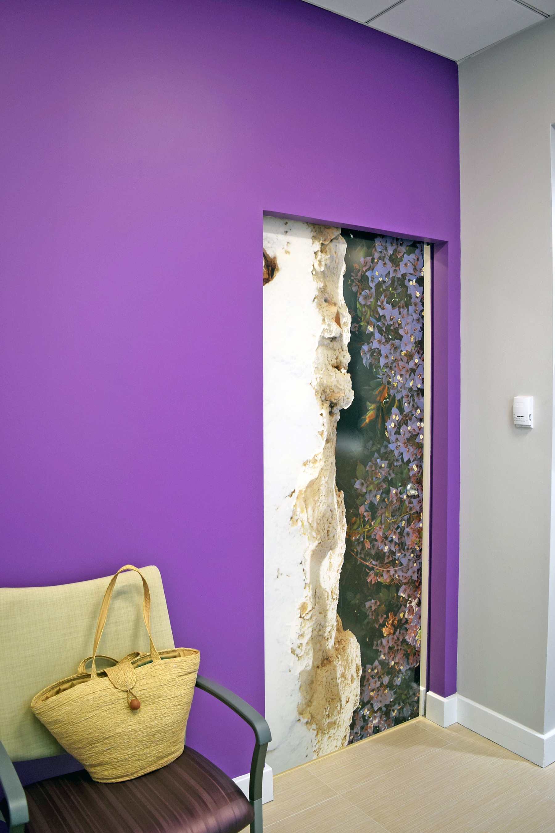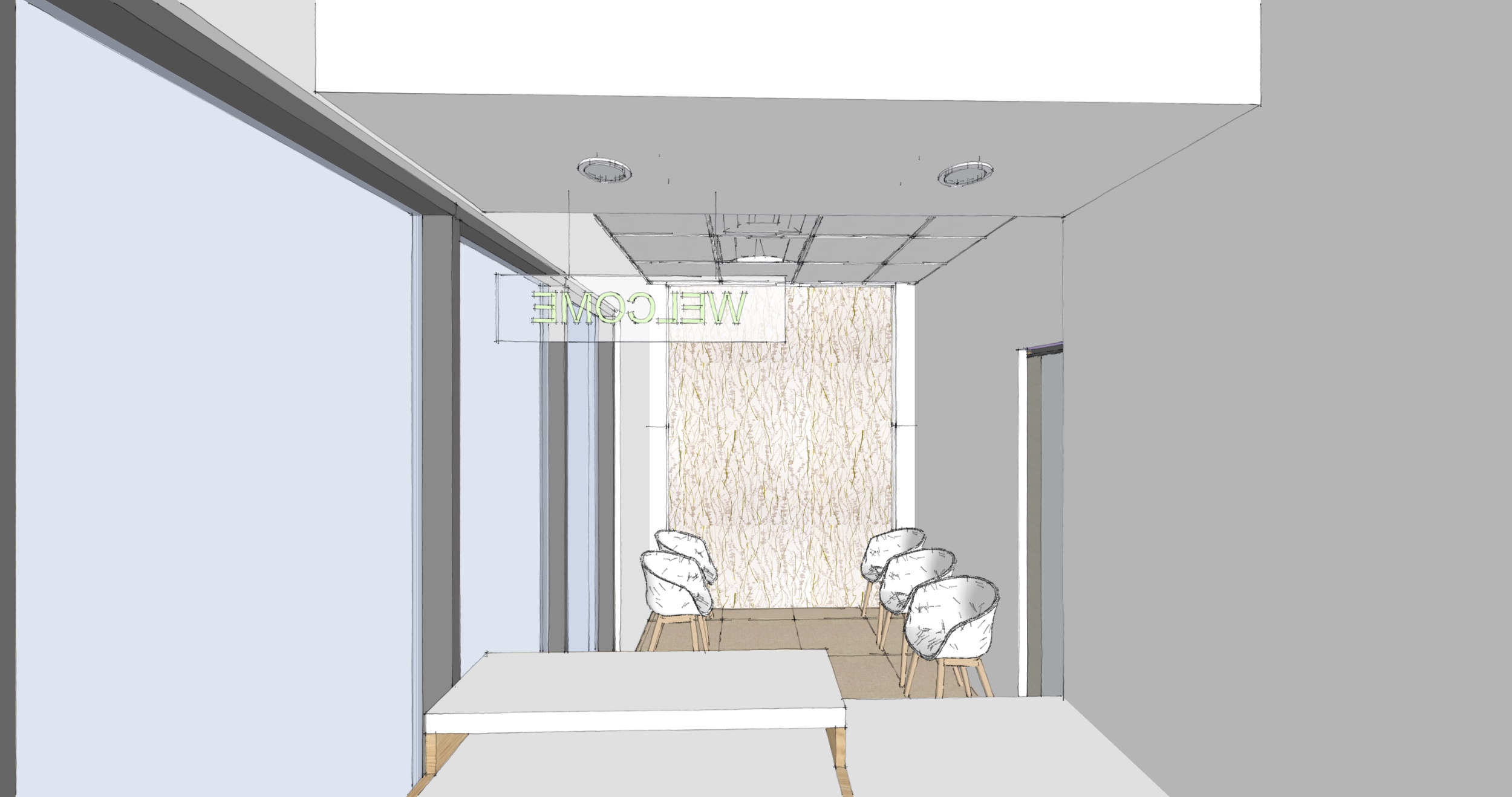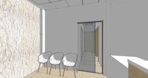 The Clinic/Office waiting area features a screen printed laminated glass pocket door, separating this area from the hallway beyond.