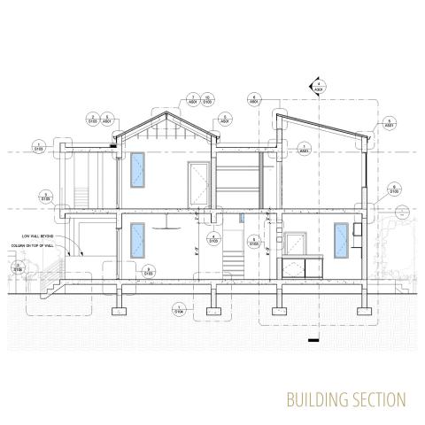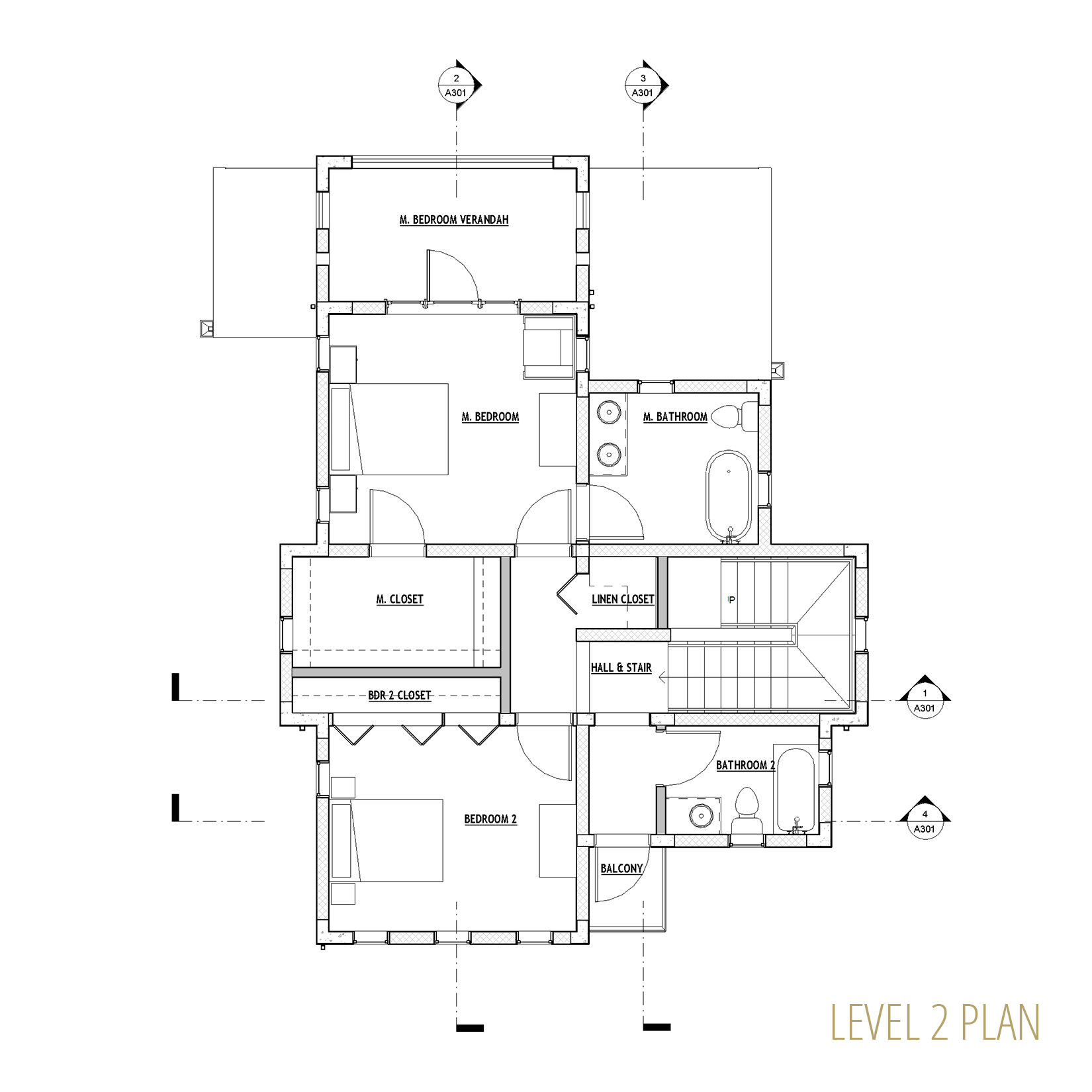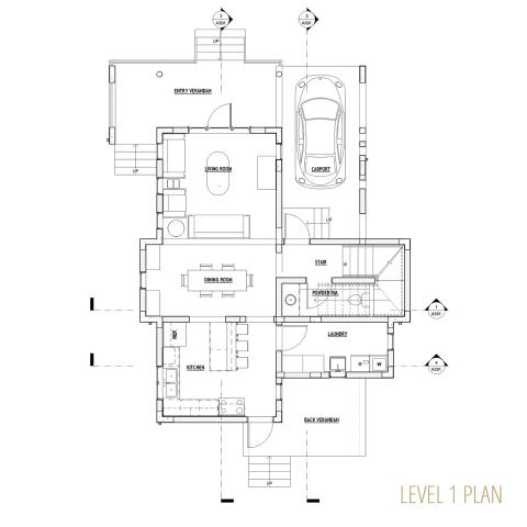 The home also needed to be easily expandable. The typical approach in this area is to build a lower floor and leave the building unfinished until a second floor could be added. We decided to go in a different direction. By creating a two-story home, we left plenty of space on the site for a future addition. If the addition is to be accessed from the existing space, the exit to the rear balcony becomes a convenient access point upstairs, while the back veranda off the kitchen becomes the platform for adding on downstairs. In the meantime the home is complete visually and functionally.